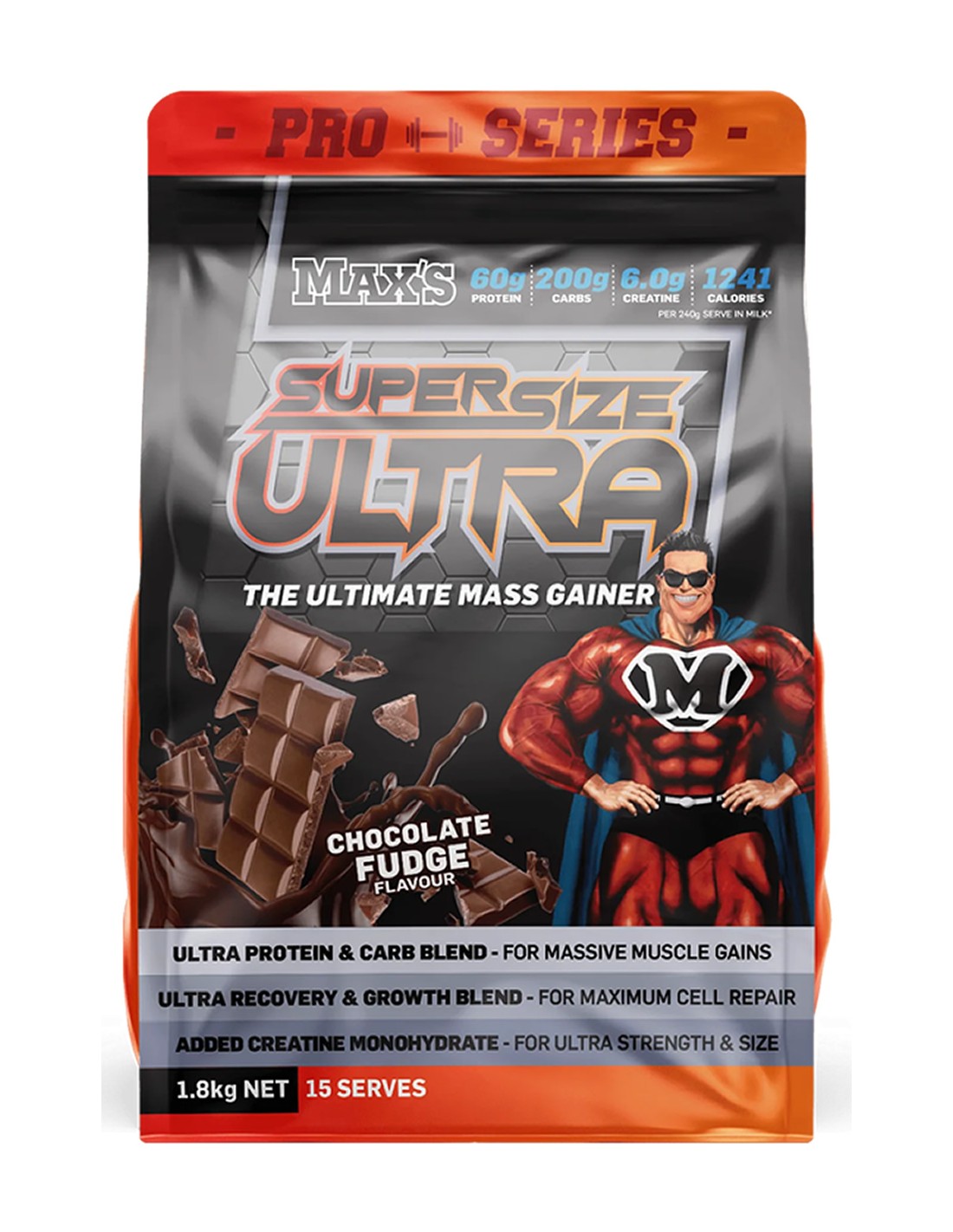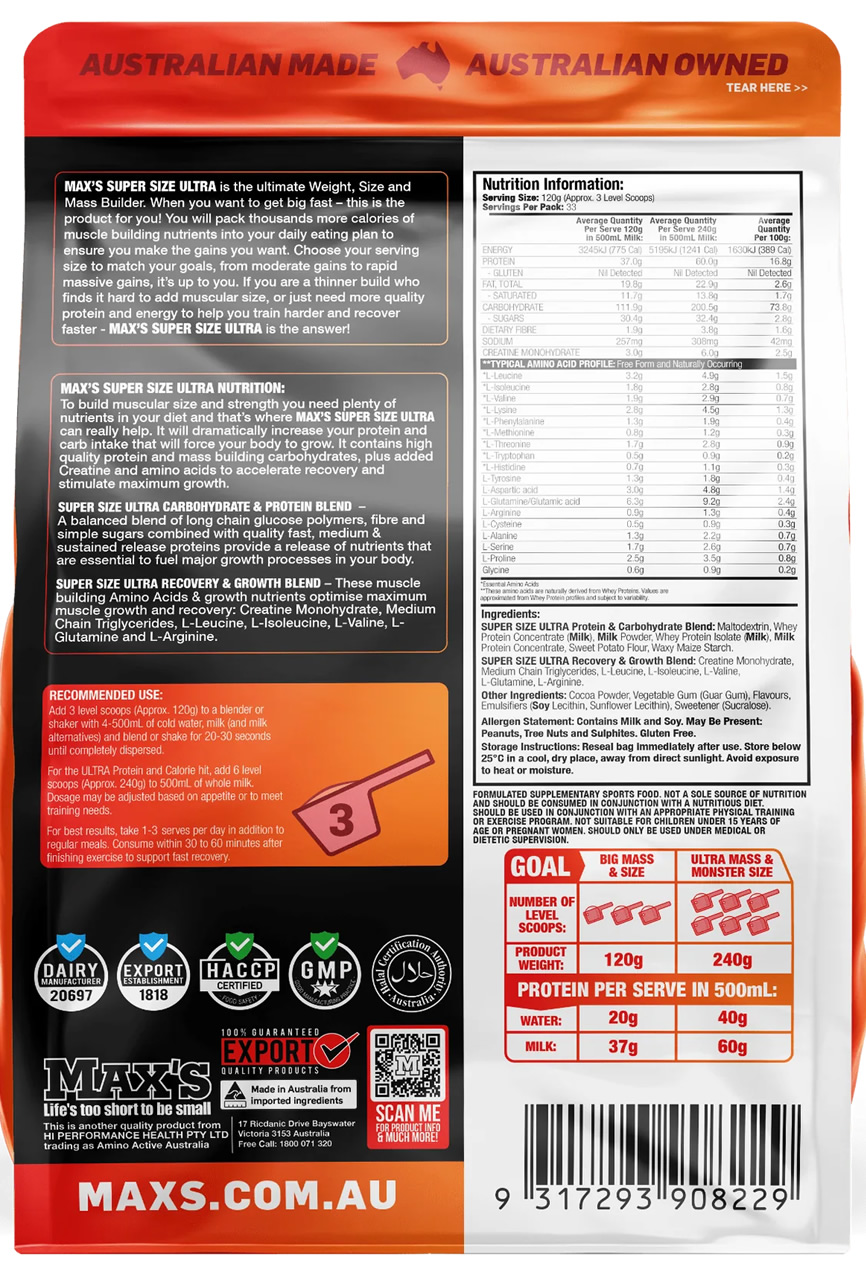 MAX’S SUPER SIZE ULTRA is the legendary mass gainer trusted by lifters who want to stack serious size, fast. Packed with essential calories, high-quality proteins, 6.0g of pure creatine, and mass-building nutrients, it is engineered to drive rapid weight and muscle gains while supporting harder training and faster recovery.